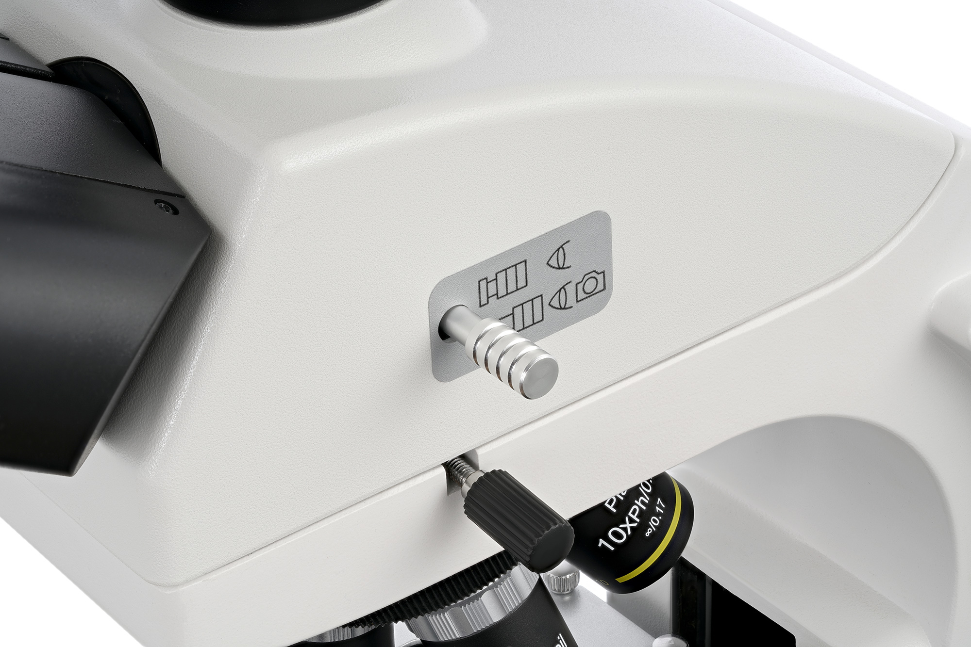 В микроскопе используется планахроматическая оптика, которая убирает хроматизм и снижает другие искажения. Передаваемая картинка получается четкой, контрастной и ясной. 10-кратные окуляры дают хороший обзор и позволяют корректировать диоптрии. Тринокулярная насадка разделена на визуальную часть и трубку для установки вертикальной камеры. Она вращается на 360°, что удобно при групповых исследованиях. А небольшой 30-градусный наклон визуального блока облегчает длительную работу с микроскопом – мышцы шеи и плечевого пояса меньше напрягаются. В револьверное устройство можно установить до пяти объективов, в комплект поставки включены четыре – это фазовые планахроматические модели. 40-кратный и 100-кратный объективы снабжены пружинящими оправами, и 100-кратный объектив можно использовать для масляной иммерсии. Оптика сделана из стекла с антигрибковым покрытием, есть грубая и точная регулировки резкости.