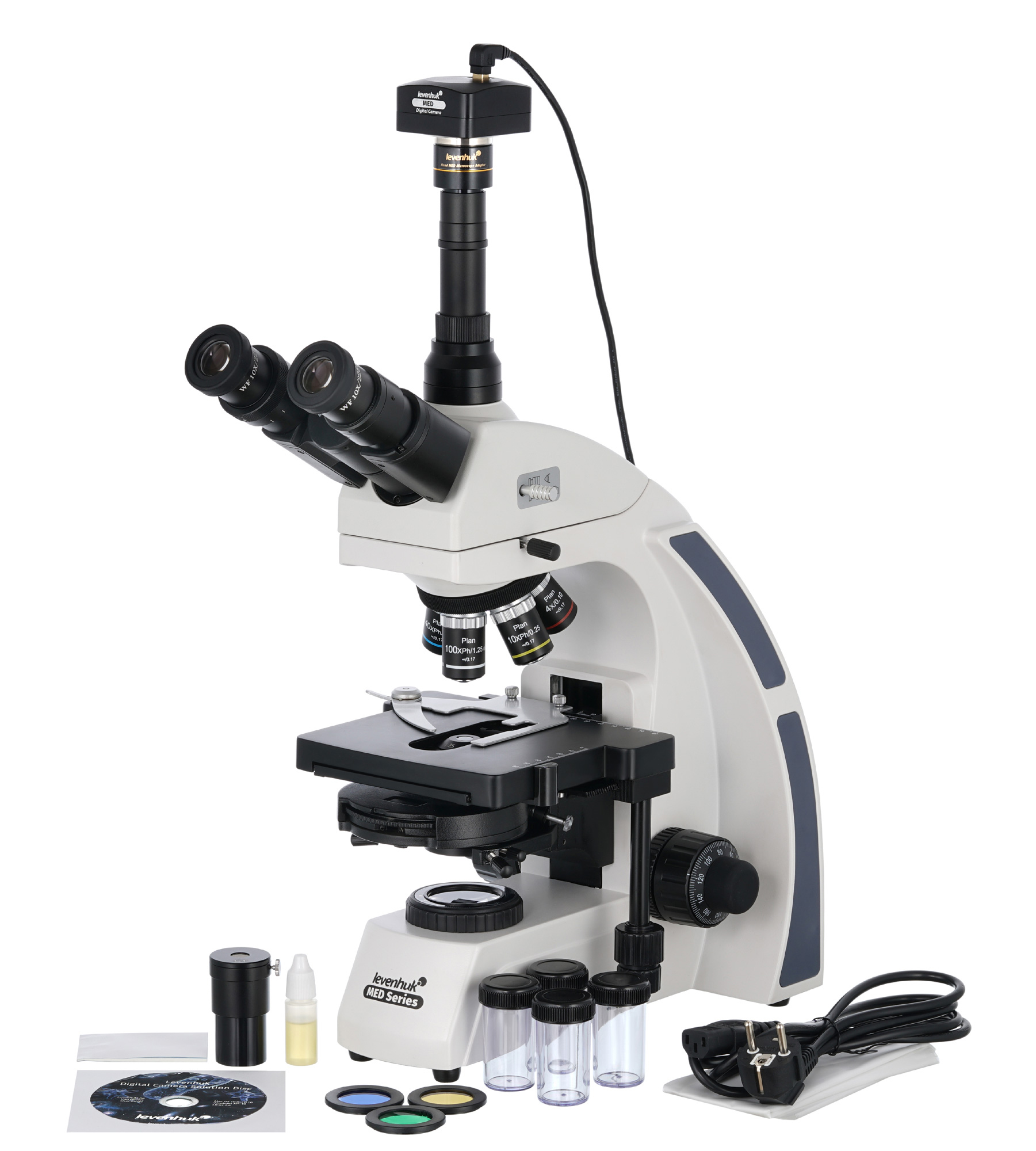 Микроскоп Levenhuk MED D45T совместим с цифровыми камерами Levenhuk (камеры приобретаются отдельно). Камеры Levenhuk устанавливаются в окулярную трубку вместо окуляра. Микроскоп также совместим с любыми другими цифровыми камерами для микроскопов.