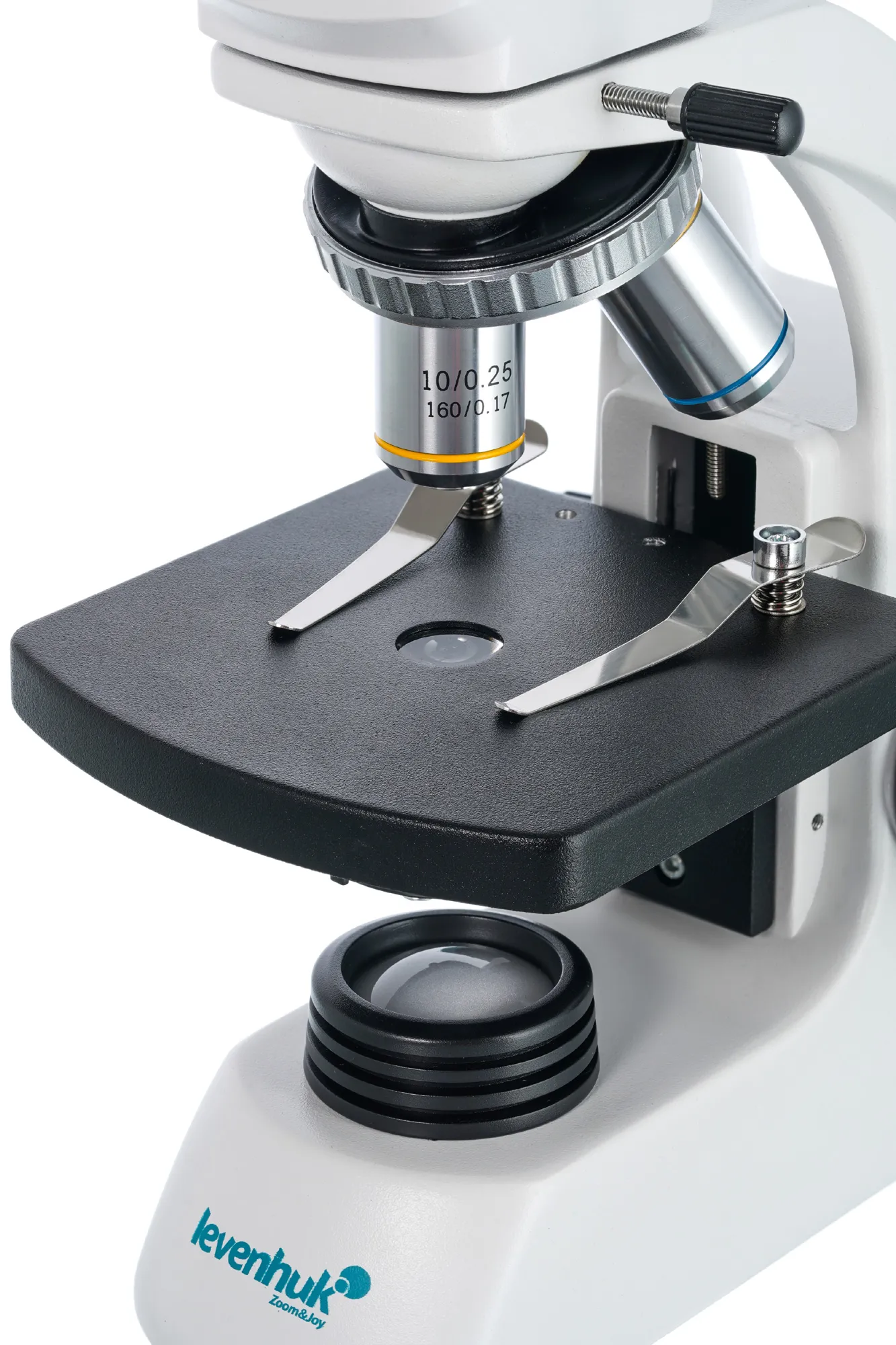 В микроскопе установлена широкопольная ахроматическая оптика. Увеличение микроскопа составляет от 40 до 400 крат, что позволяет изучать средние и крупные структуры. Передаваемая картинка четкая и ясная, контрастность деталей находится на высоком уровне. Насадка микроскопа имеет наклон в 45°, что повышает комфорт длительных наблюдений. Кроме того, насадку можно поворачивать на 360°. Револьверное устройство вмещает три объектива, причем 40-кратный объектив снабжен пружинящей оправой – для защиты передней линзы от повреждений.