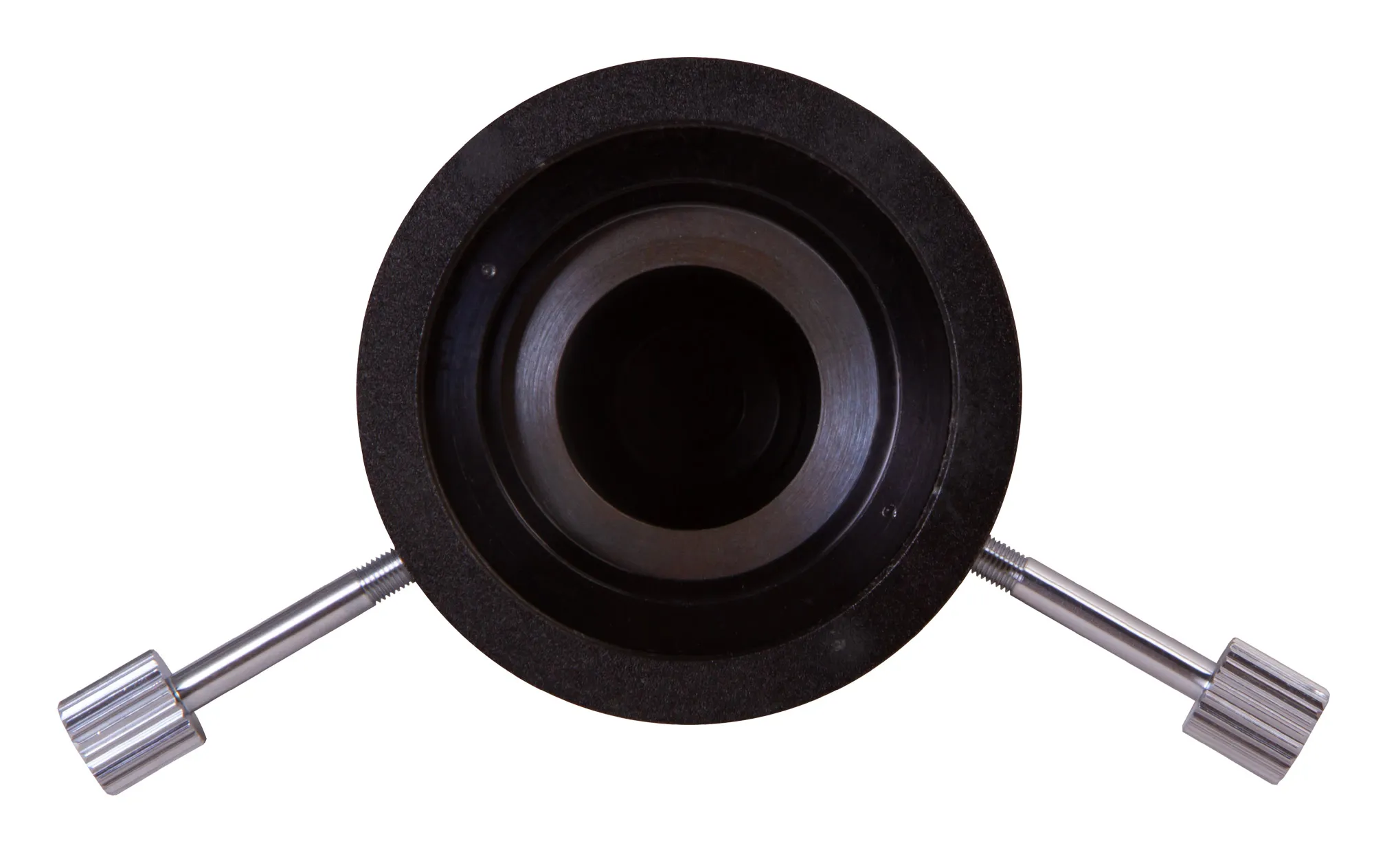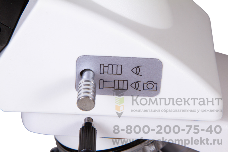 Тринокулярная насадка – возможность одновременно изучать образцы и показывать их изображение на внешнем экране при помощи цифровой камеры. Камера в комплект поставки не входит, но отдельная вертикальная трубка для ее установки присутствует. Визуальная часть имеет небольшой наклон в 30°, а всю насадку можно поворачивать на 360°. Есть делитель светового потока.