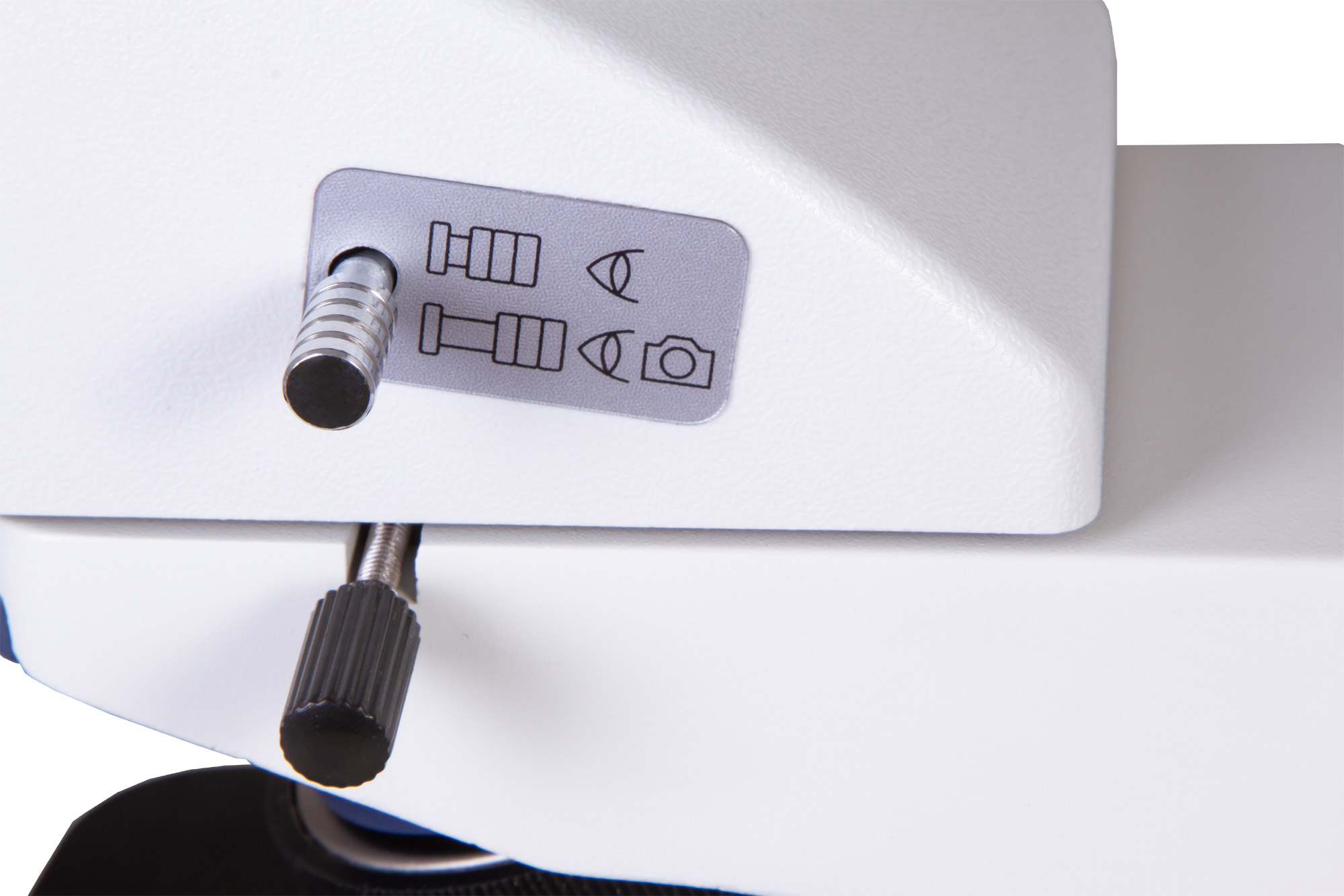 Тринокулярная насадка вращается на 360° и имеет стандартное разделение на визуальную часть и окулярную трубку для установки цифровой камеры. Есть делитель светового потока. Бинокулярный блок для классических наблюдений отклонен на 30°, что повышает комфорт при длительной работе с микроскопом. Третья окулярная трубка расположена вертикально, цифровая камера в комплект поставки не входит.