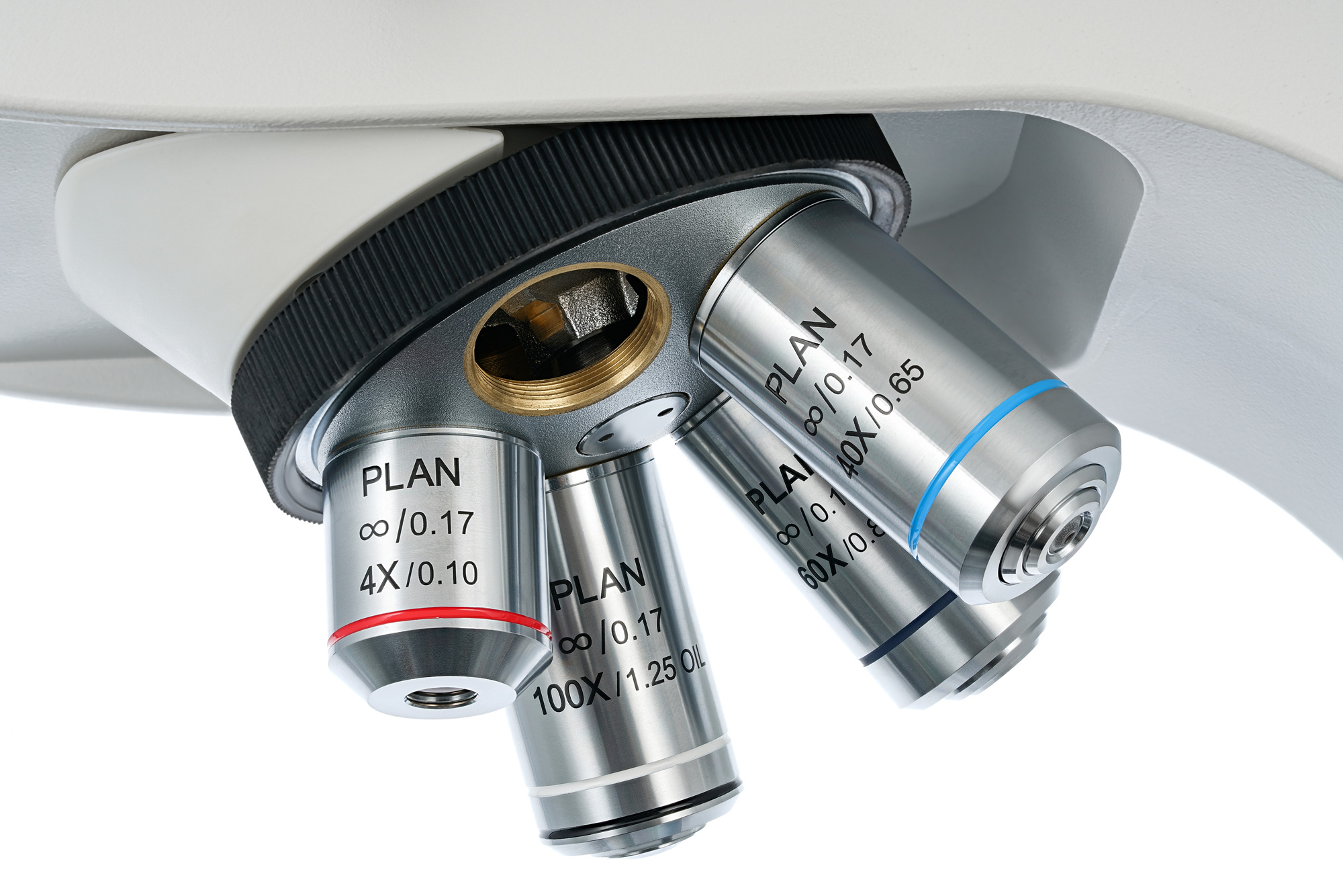Планахроматическая оптика минимизирует искажения и передает четкую и ясную картинку по всему полю зрения. Она сделана из оптического стекла, защищенного антигрибковым покрытием. В комплекте пять объективов, менять кратность можно одним вращением револьверной головки. Три объектива с наибольшим увеличением снабжены пружинящими оправами, а 100-кратный объектив предназначен для использования при наблюдениях по методу масляной иммерсии. Два окуляра обеспечивают хороший обзор и дают 10-кратное увеличение. Благодаря диоптрийной коррекции резкость можно настроить под особенности зрения наблюдателя. Дополнительно можно использовать ручки грубой и точной фокусировки.